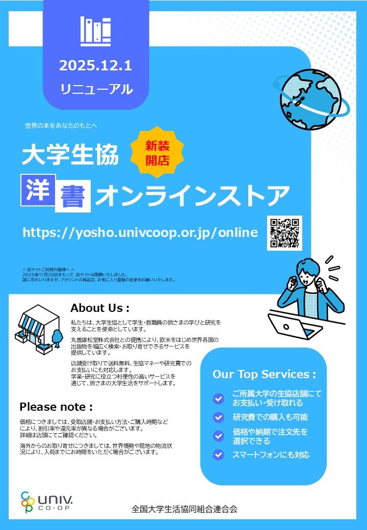 大学生協洋書オンラインストアは、2025年11月下旬をもって運用を停止し、2025年12月1日(月)午前10:00より新たな洋書オンラインストアが稼働いたします。